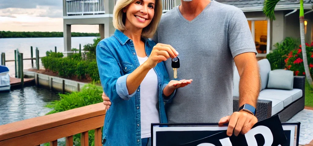 Image Suggestion: A couple standing on the deck of a Florida waterfront home, looking out over the water with a “Sold” sign in the foreground.